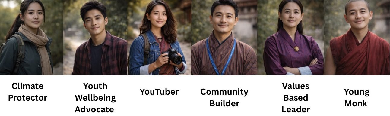 The film follows six Bhutanese participants, each representing a facet of contemporary Bhutanese society – A Climate Protector – A steward of Bhutan’s forests and natural heritage, a Youth Resilience Champion – A young person who has overcome adversity and now supports others, a popular YouTuber who is a creative voice bridging tradition and modern expression, a Community Builder – A changemaker strengthening social cohesion and livelihoods, a Values-Based Leader – A teacher or public servant rooted in service and integrity and a Young Buddhist Monk – A spiritual anchor connecting the journey to Buddhist lineage.