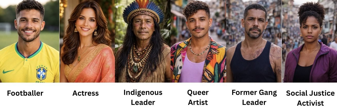Each participant carries a deeply personal story of struggle and resilience — a mid career footballer seeking to inspire youth beyond sport, a widely respected actress who acted in a Brazilian series about India, a favela-based female activist confronting drug violence, a former gang member looking at healing and transforming his community, a queer artist exploring identity and belonging, an Indigenous rainforest guardian preserving ancestral medicine.